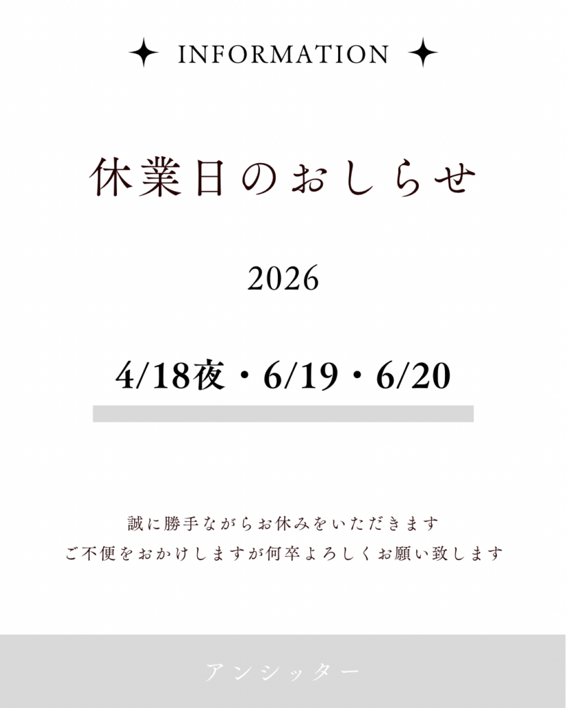 【休業日】4月18日(土)16時以降・6月19日(金)終日・6月20日(土)終日